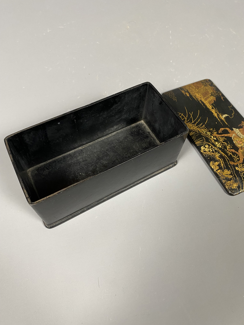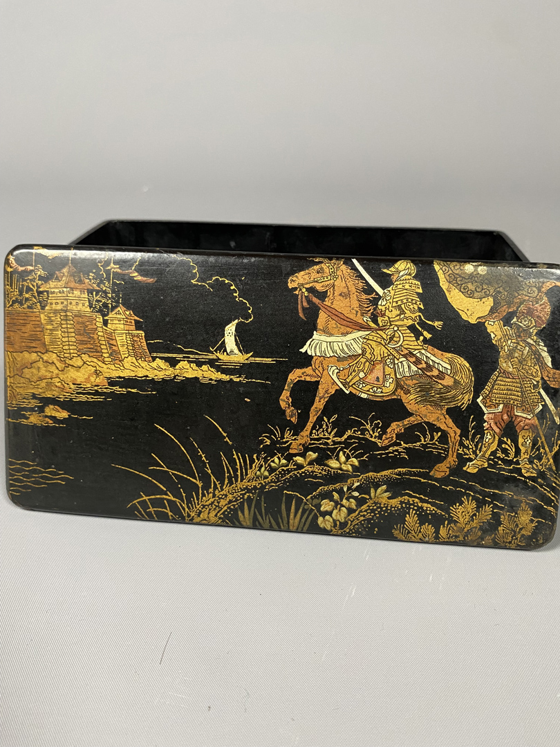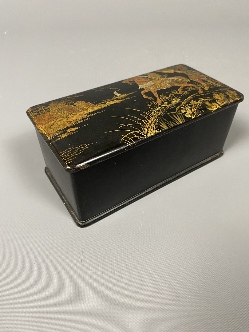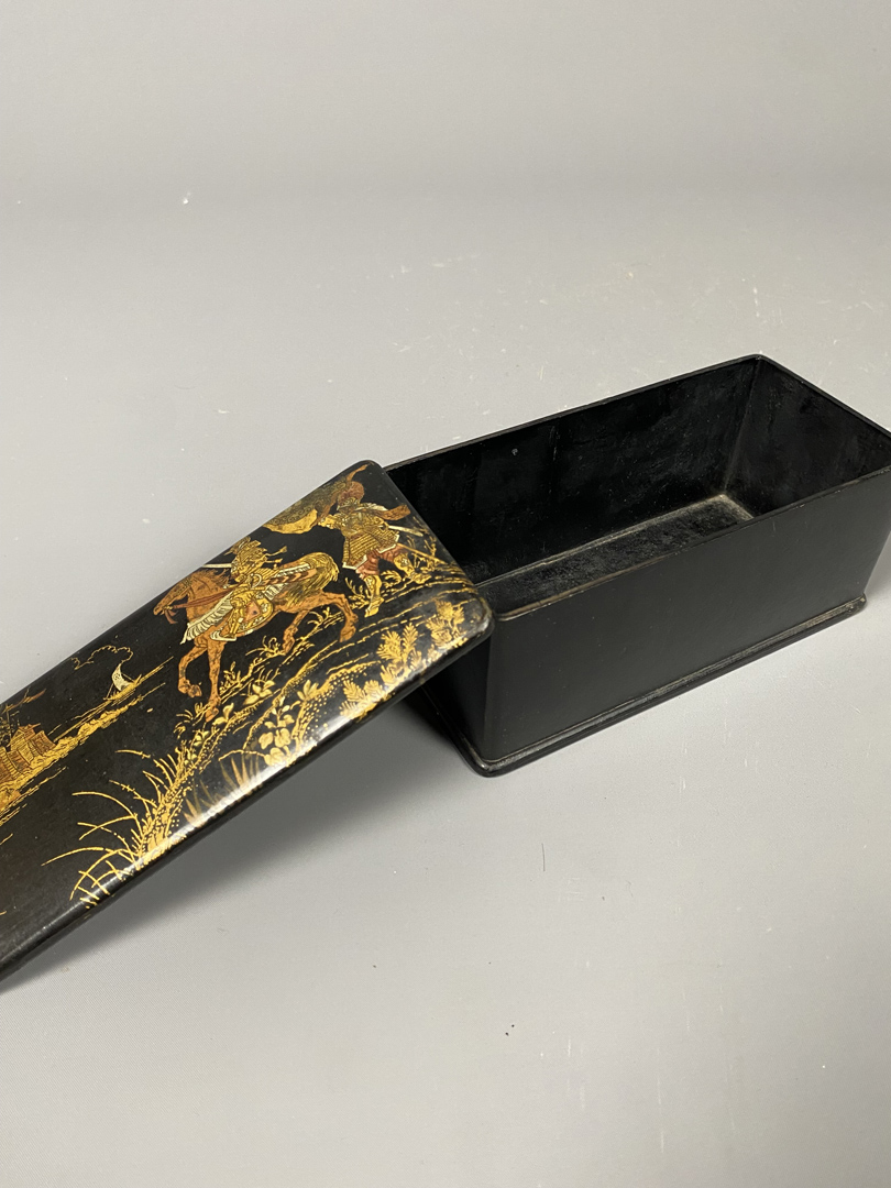 Boîte Napoléon III, laquée noir, en carton bouilli. Scène de guerriers chinois, dans des tons mordorés.