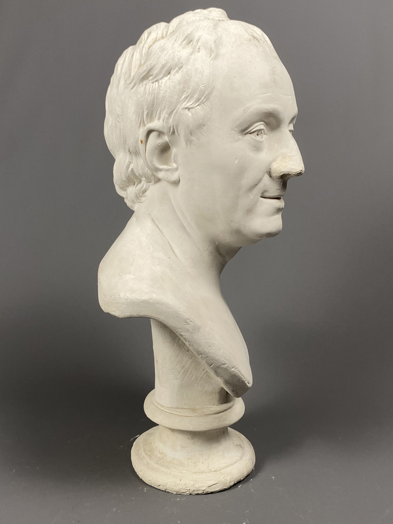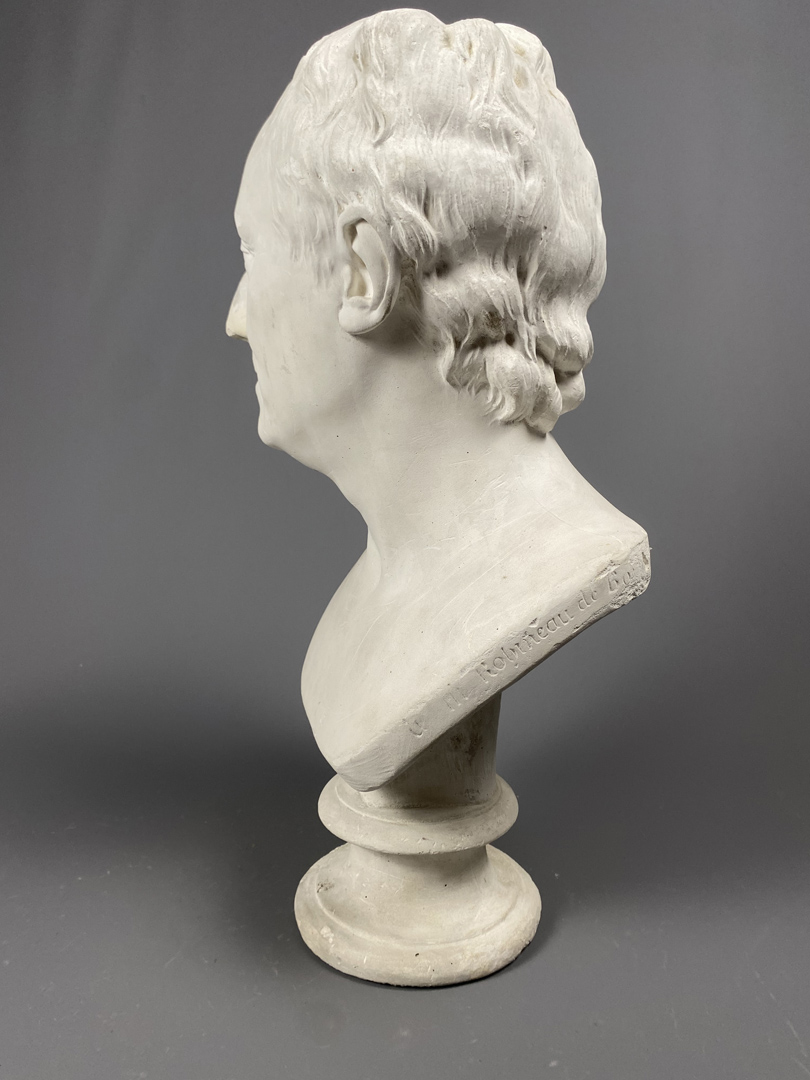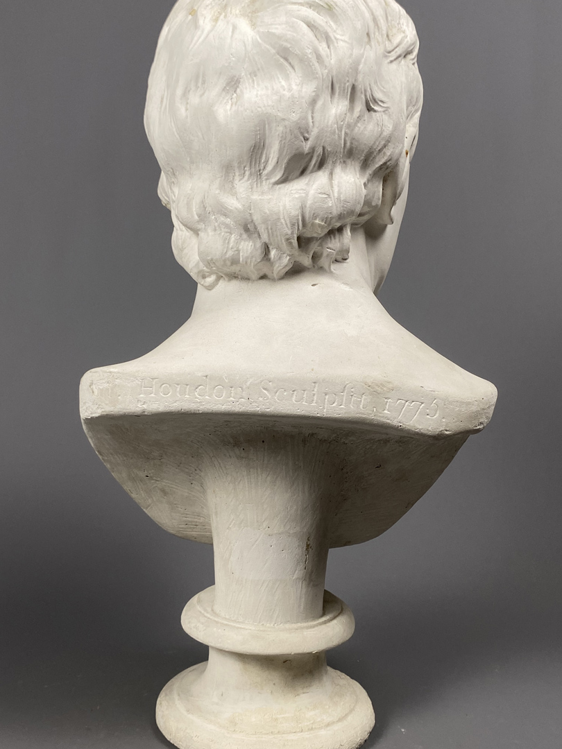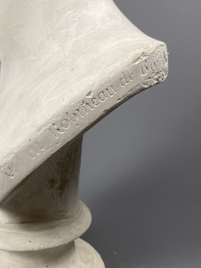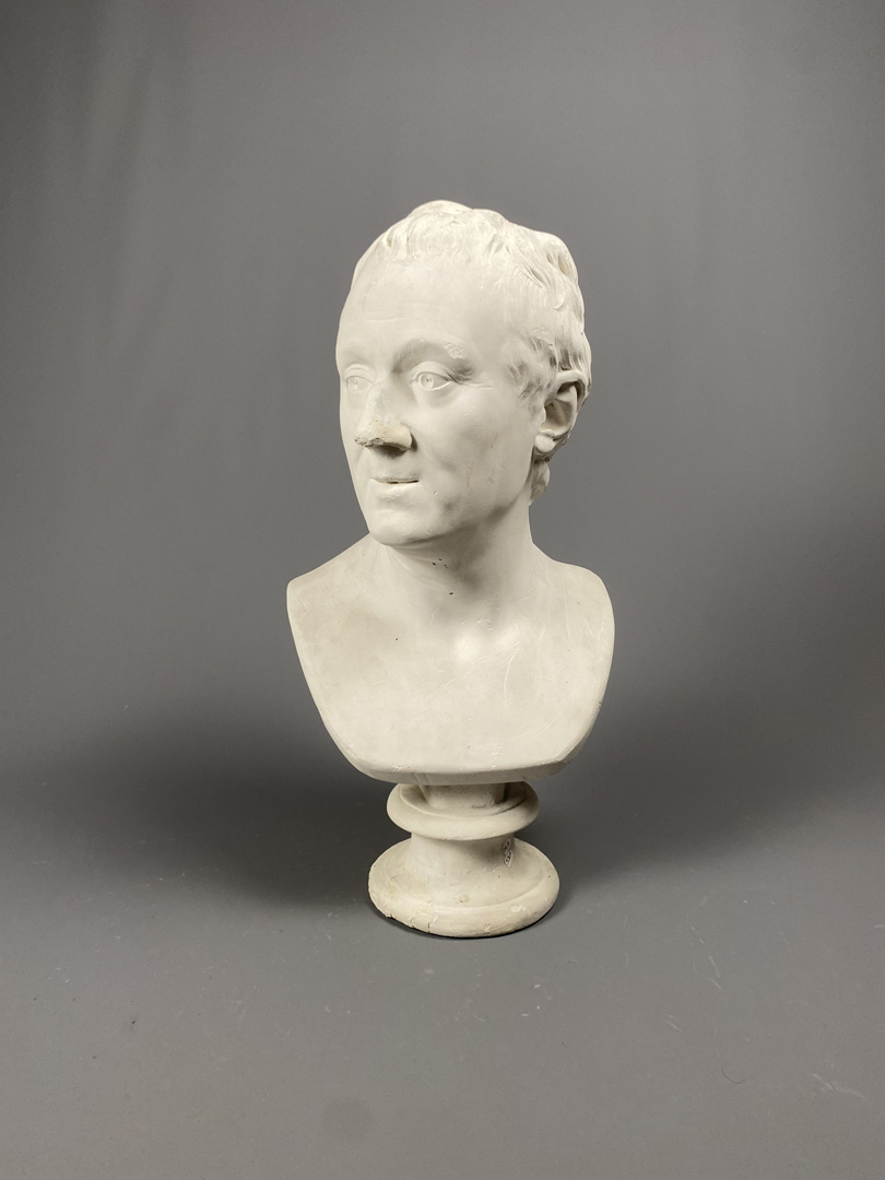 Buste de Diderot, en plâtre, annoté “A monsieur de Bougon”, d’après Houdon, 1775. A signaler quelques griffures et manques.
