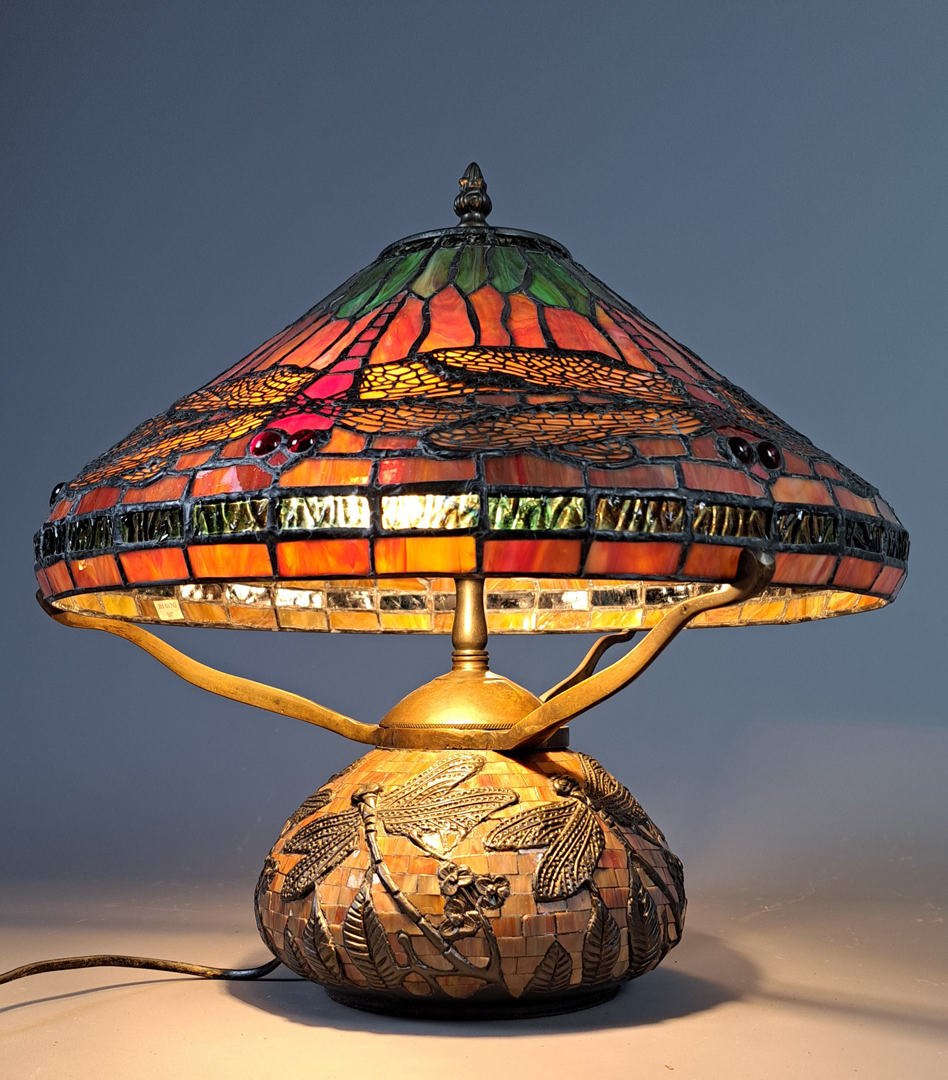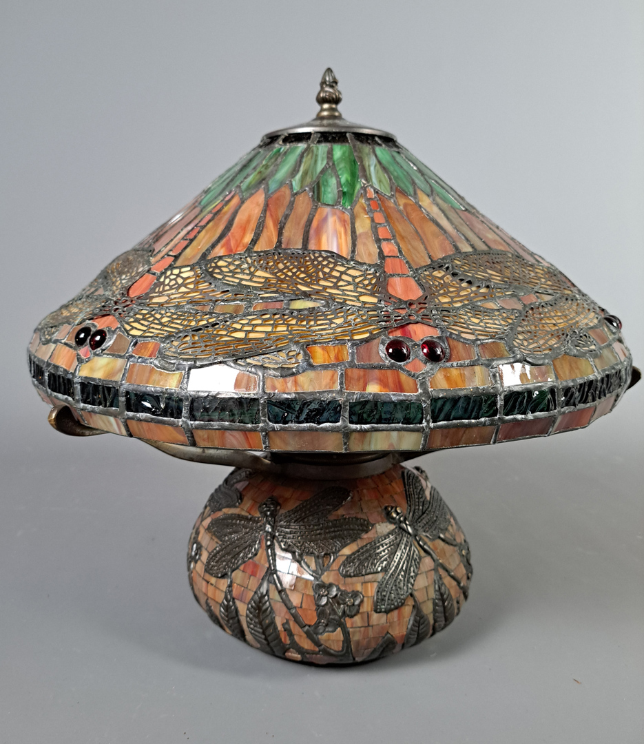 Lampe de style TIFFANY, pied et branches support en bronze, à décors de végétaux et libellules dans une mosaïque de tesselles en pâte de verre.
