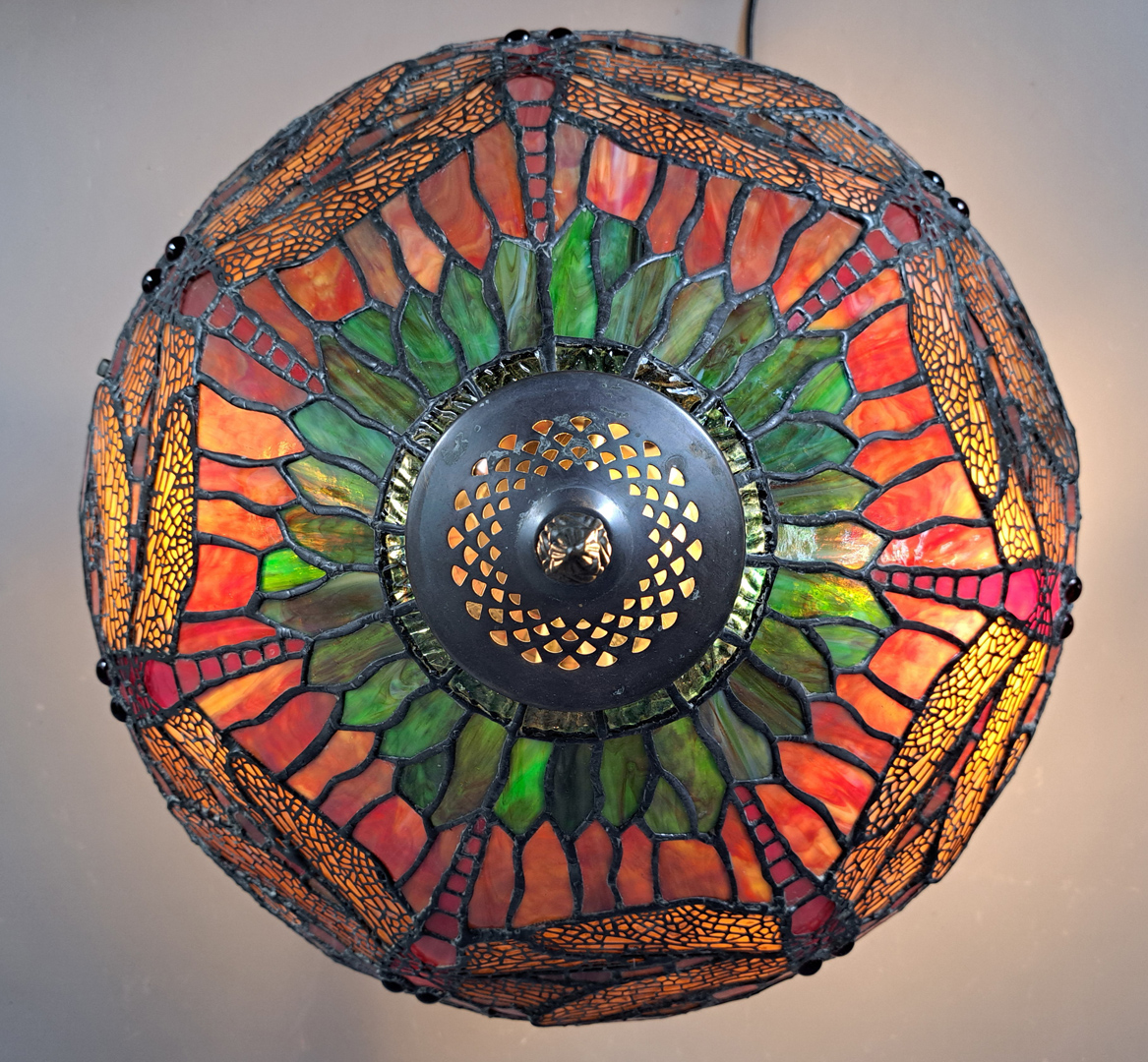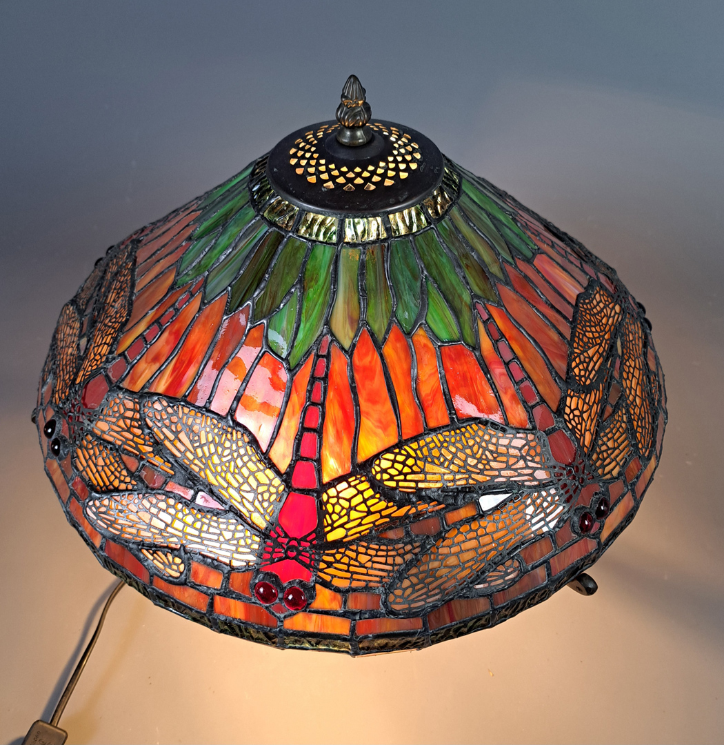 Grand abat-jour en vitrail de pâte de verre dans les tons verts , orangés et grenats à décors de libellules.