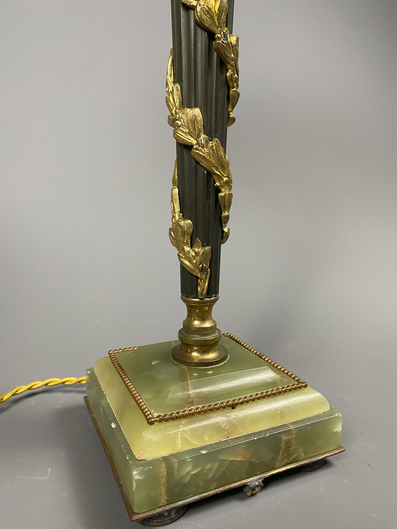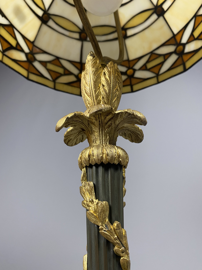 Grande lampe 1900. Constituée d’un beau pied en métal cannelé, à enroulements et palmettes en bronze ciselé doré.