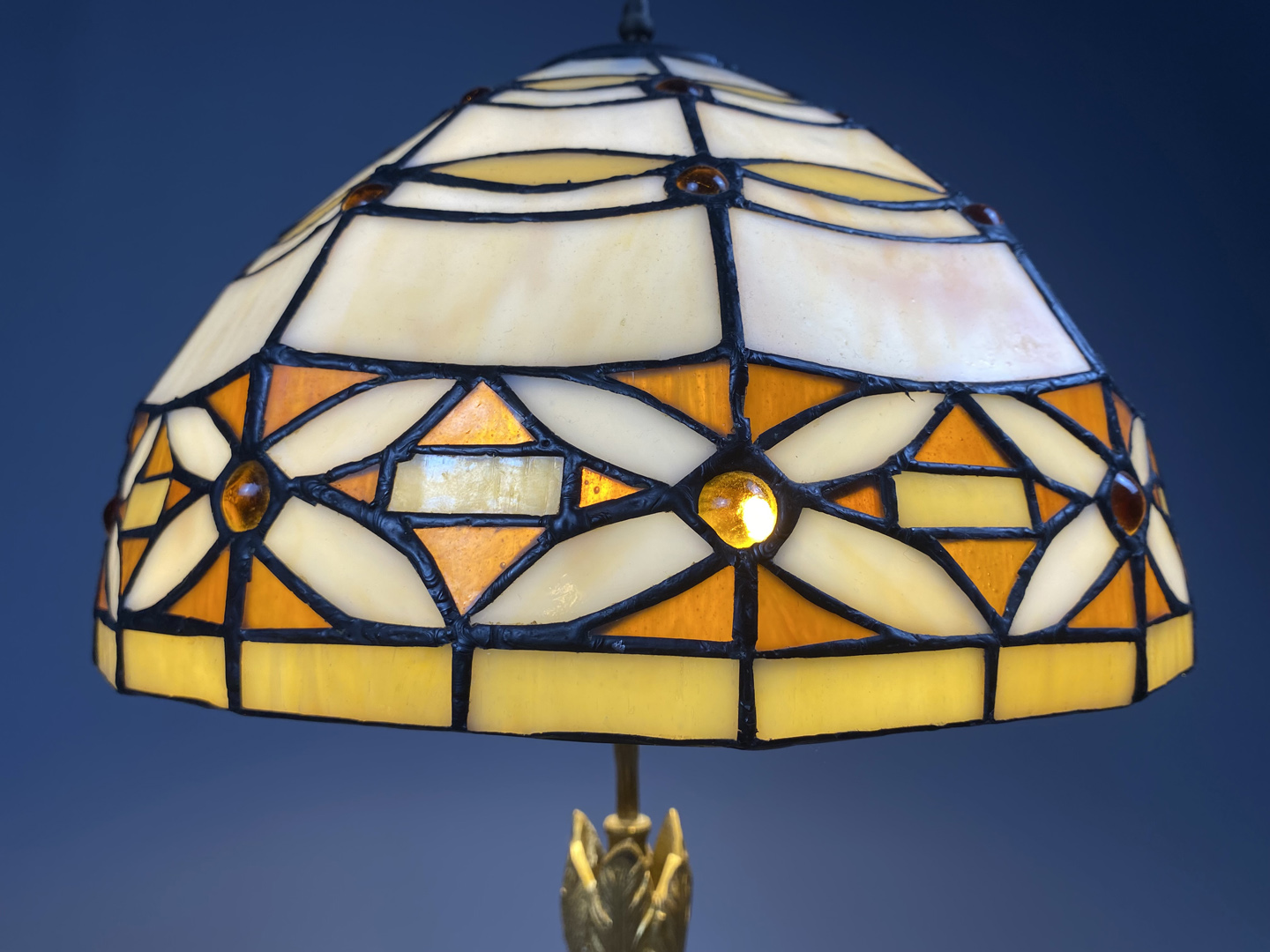 Bel abat-jour de style Tiffany, pâte de verre et cabochons ambrés, en bon état