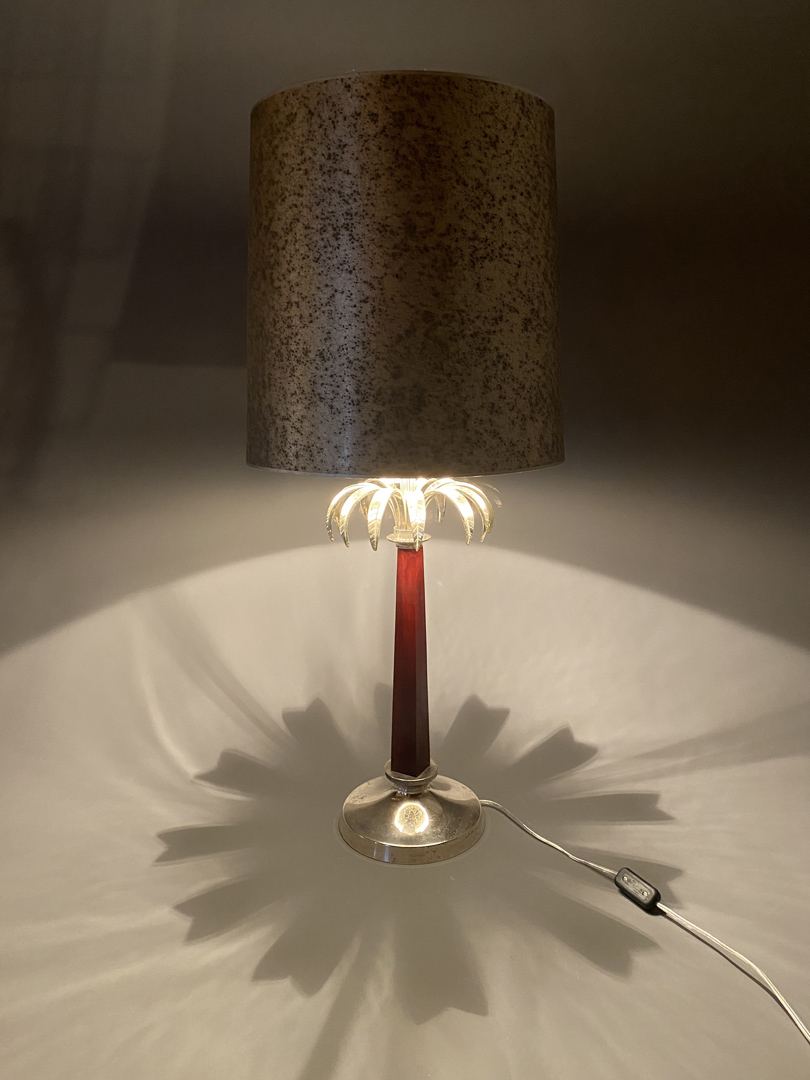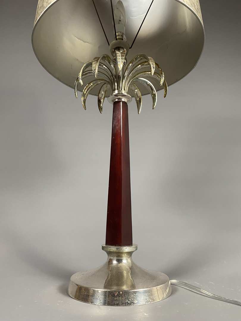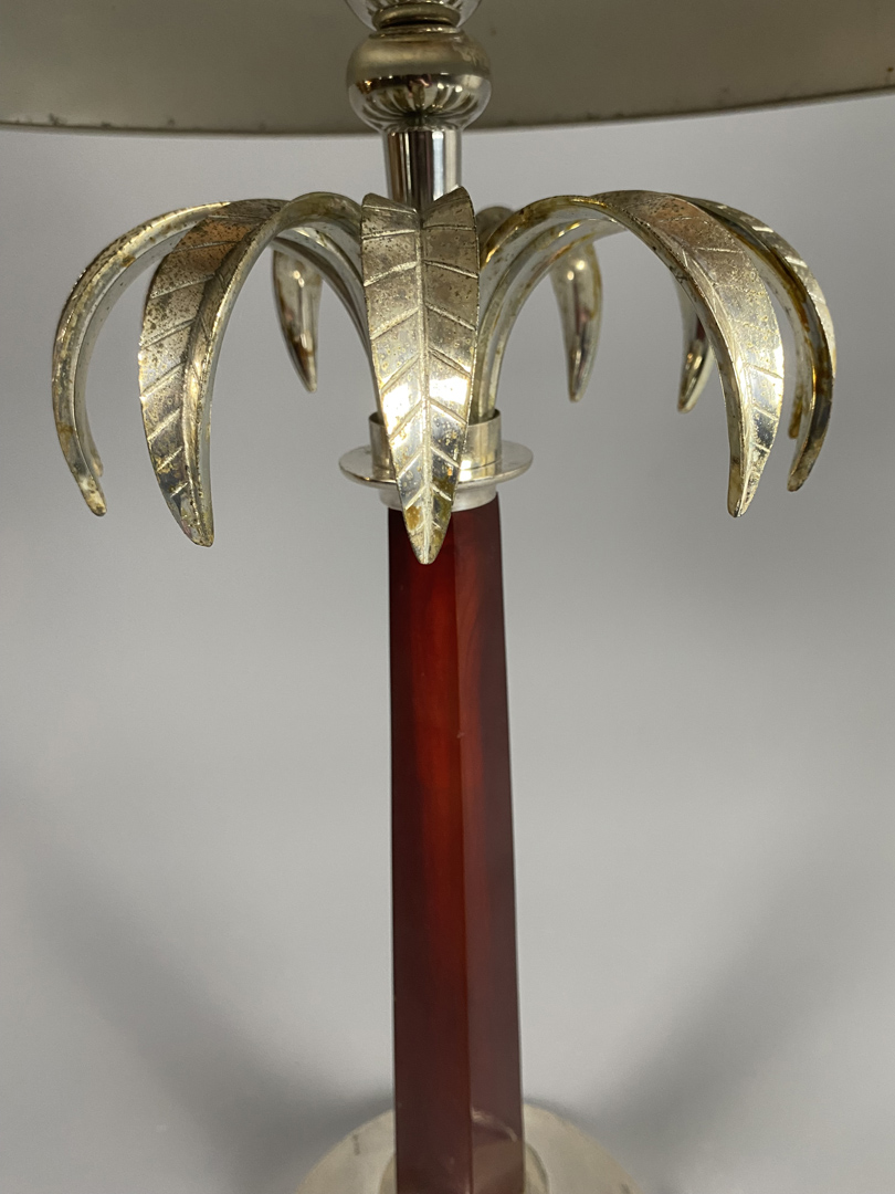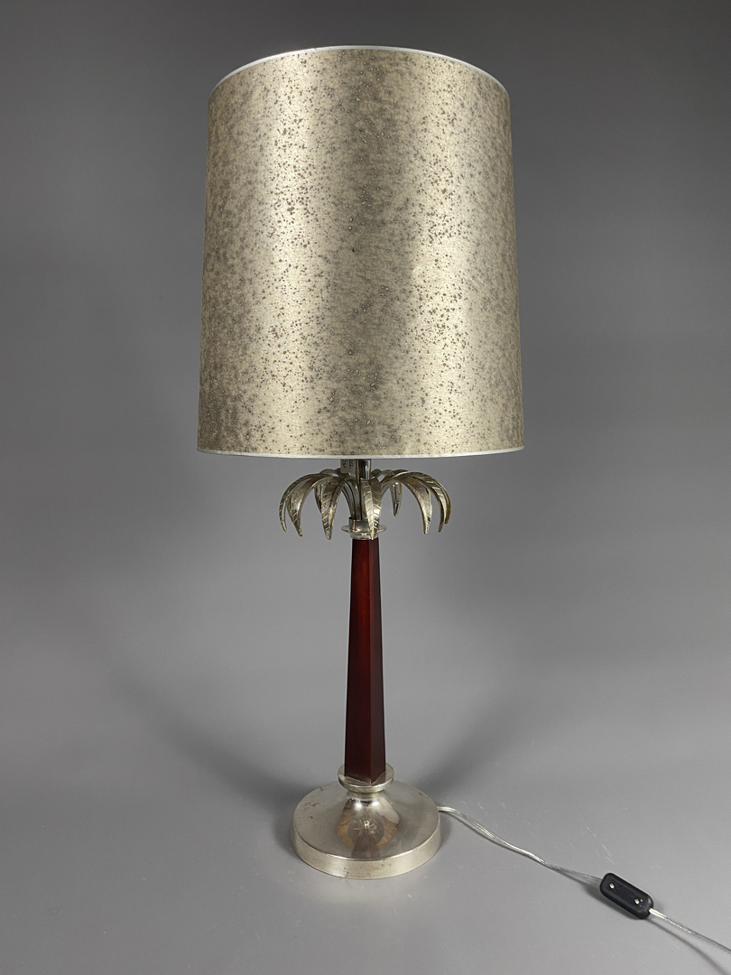 Lampe palmier en bronze argenté et colonne carrée en bakélite grenat translucide. Abat-jour d’origine métallisé. Etat d’usage, des piqûres sur le métal et quelques pliures visibles à l’intérieur de l’abat-jour.