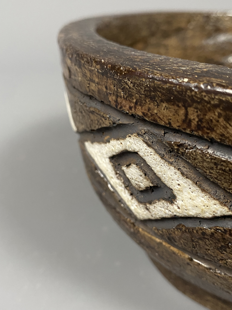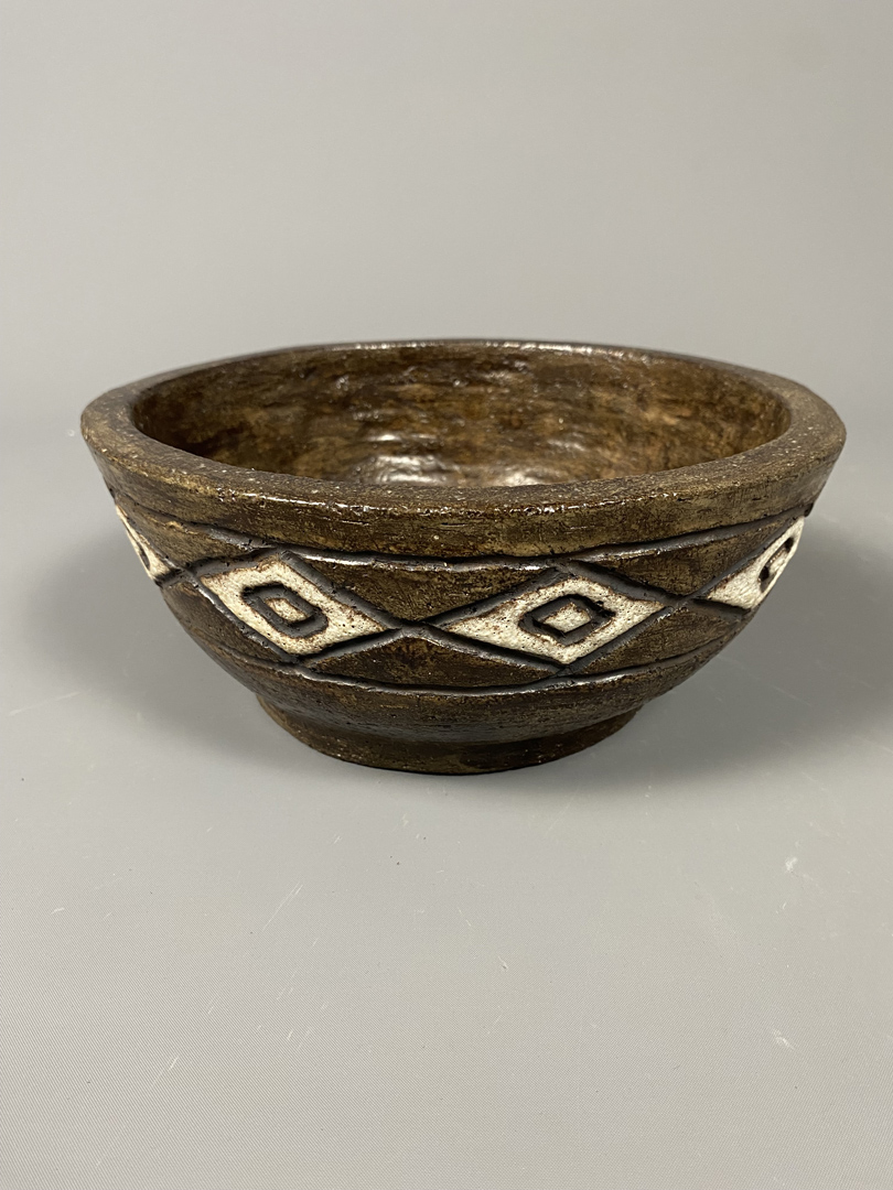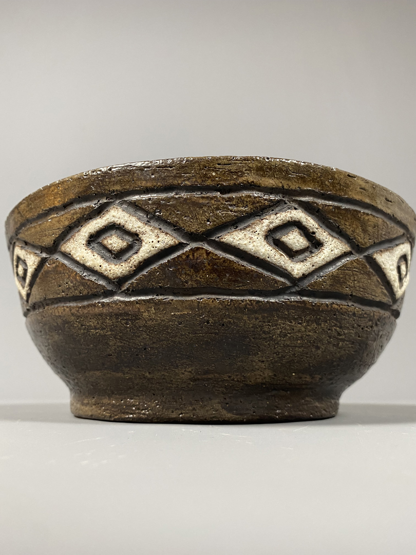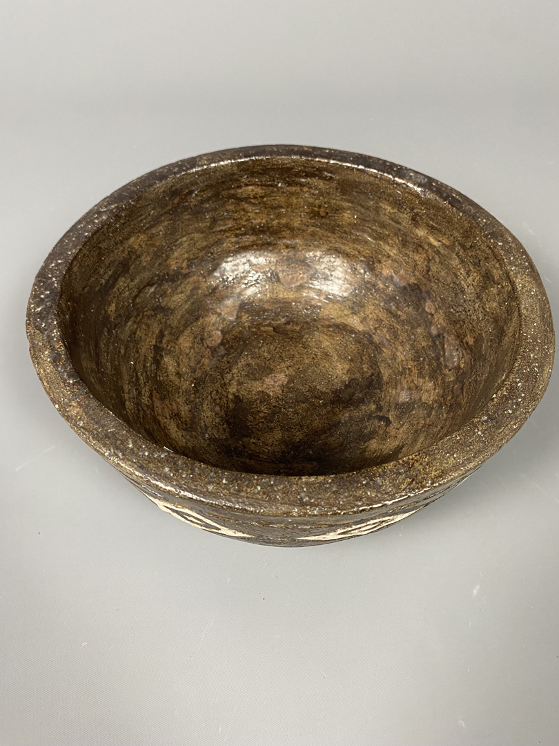 Large bol en grès à couverte brune. Décor incisé d’une frise à losanges  “Fat Lava » blancs.