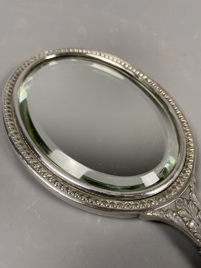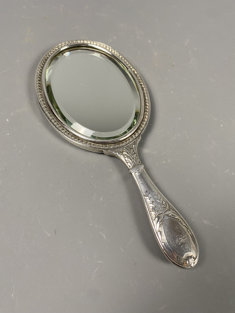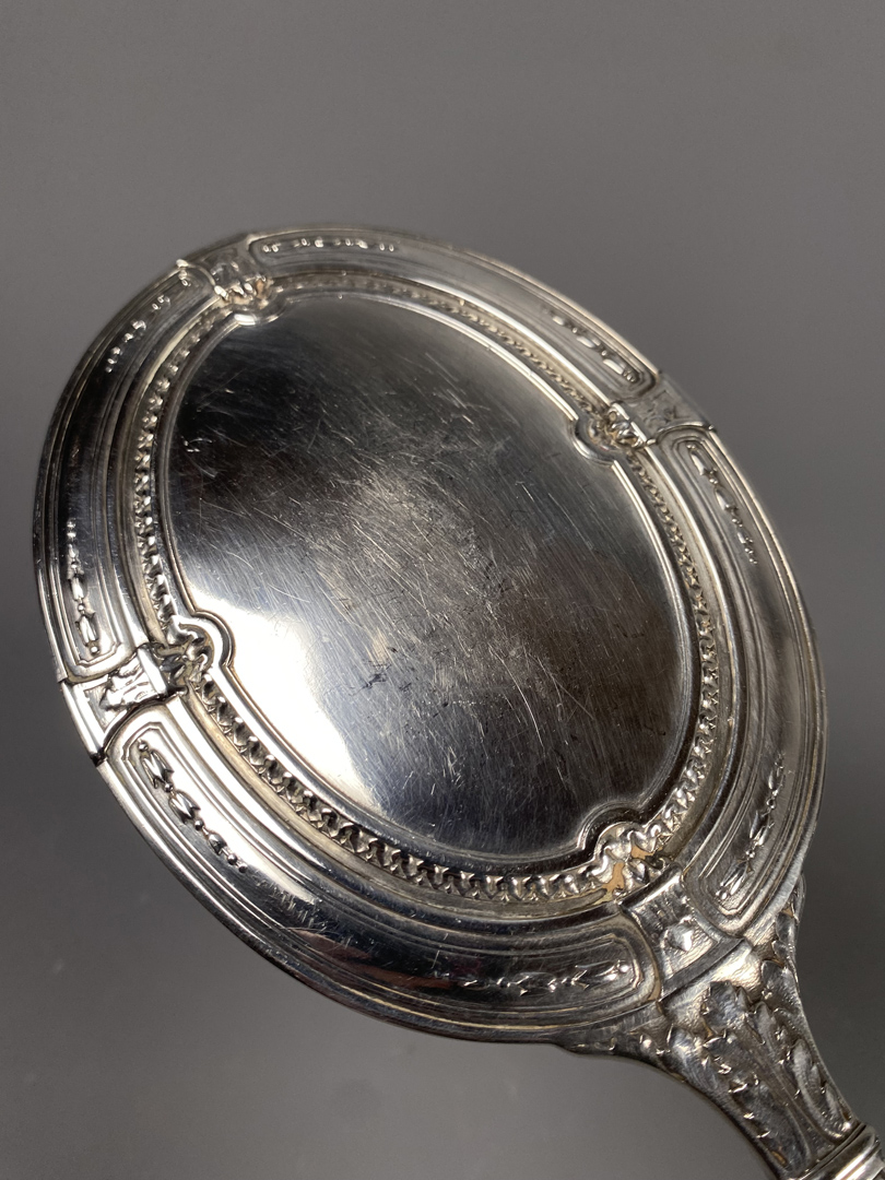 Miroir face à main en métal chromé de style Louis XVI à miroir biseauté.