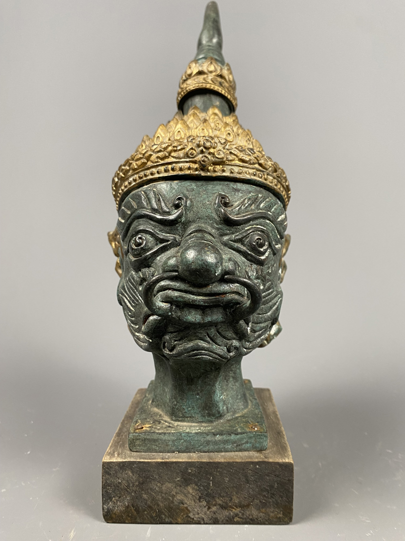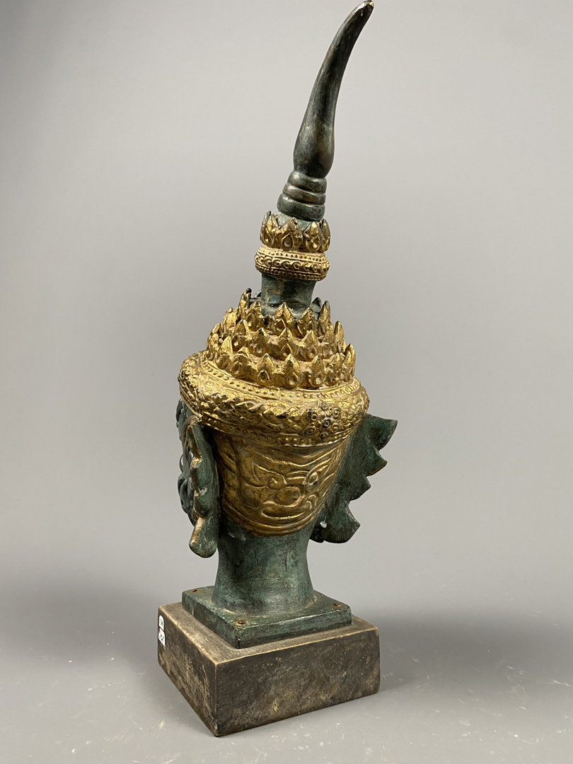 Tête de divinité en bronze Asie du sud-Est (XXème), à patine vert de gris et or, sur socle en bois exotique.